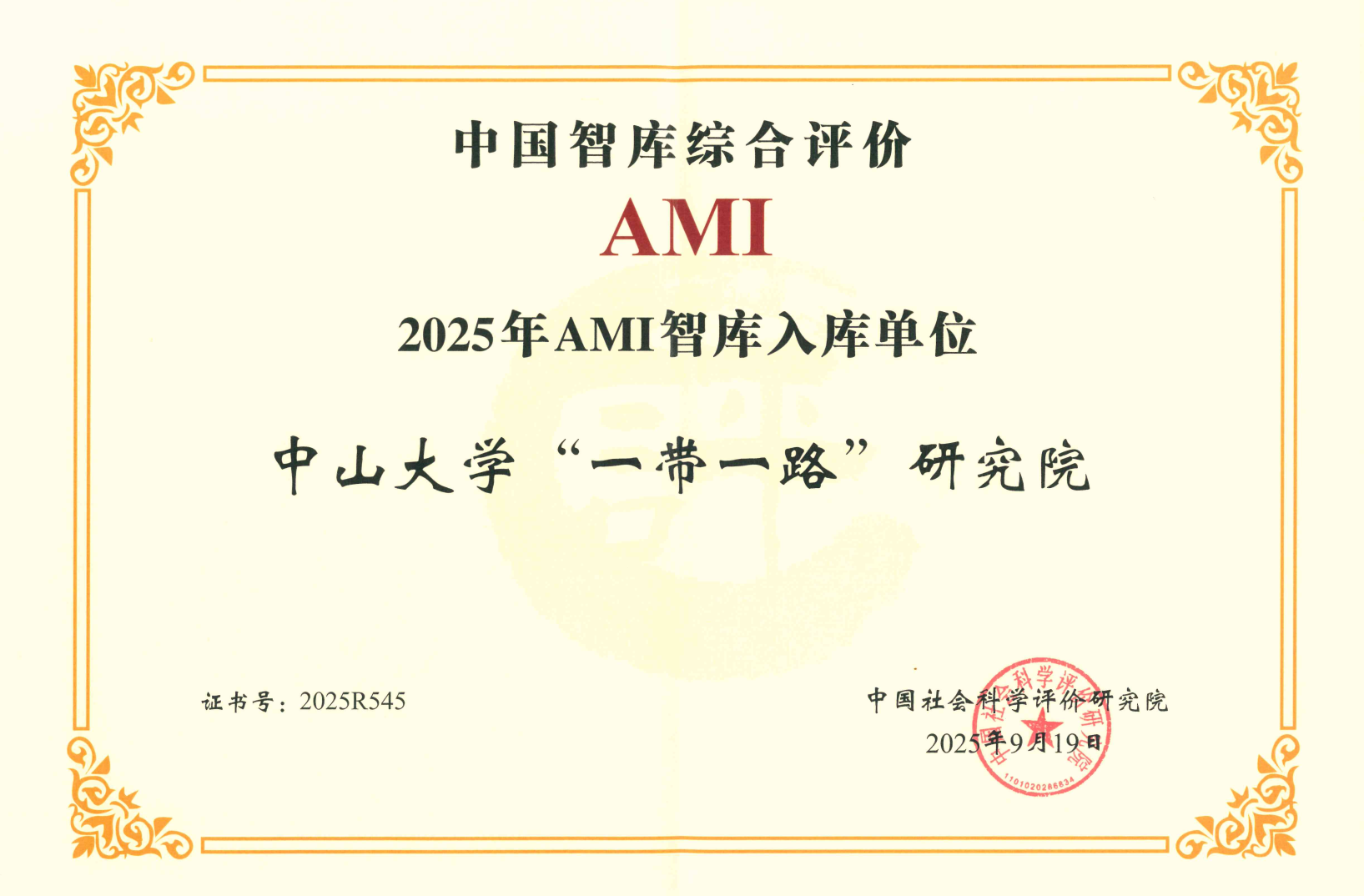 近日,中国社会科学评价研究院正式公布中国智库综合评价研究项目(2025)AMI智库入库单位名单,中山大学“一带一路”研究院入选。