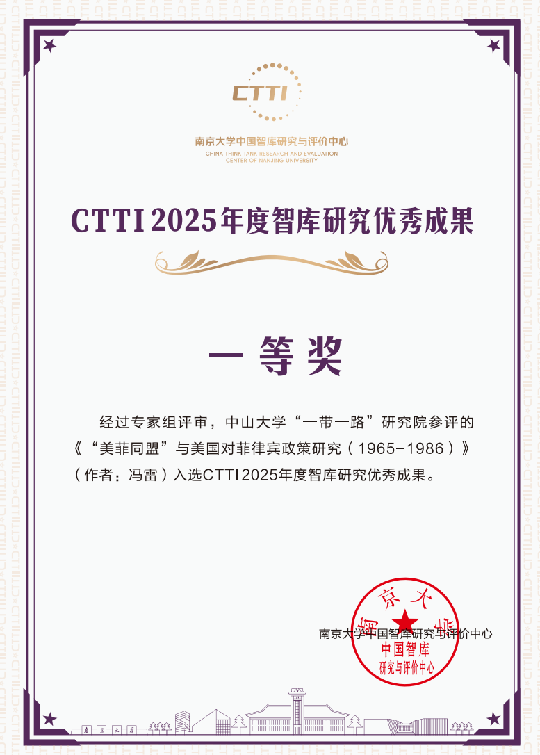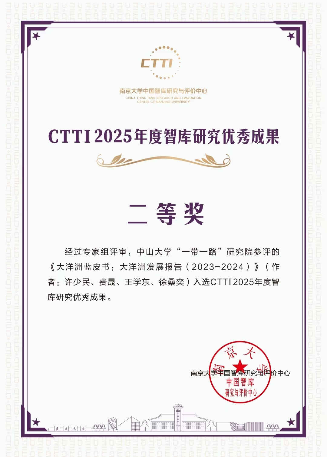 论坛发布了“2025CTTI智库建设最佳案例和智库研究优秀成果征集结果”。由研究院推荐参评的成果《“美菲同盟”与美国对菲律宾政策研究(1965-1986)》《大洋洲蓝皮书:大洋洲发展报告(2023-2024)》分别获评CTTI2025年度智库研究优秀成果一等奖、二等奖。