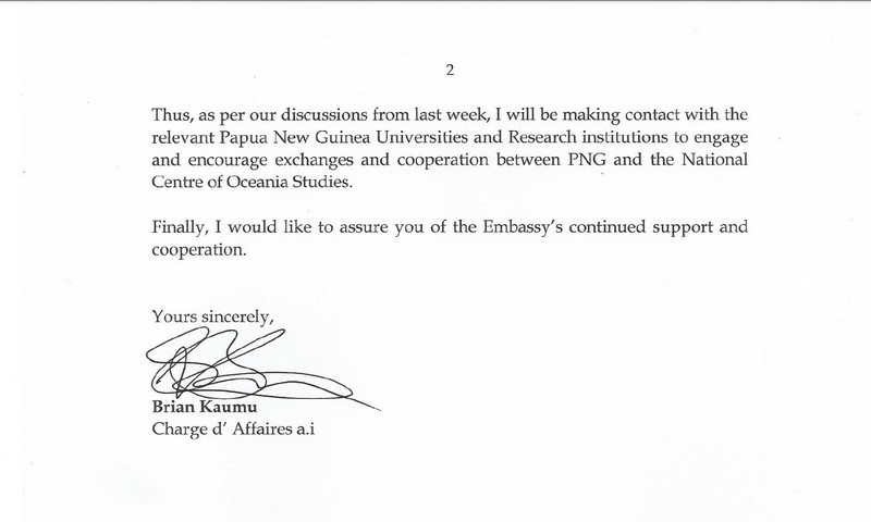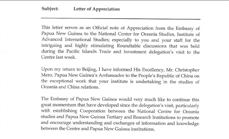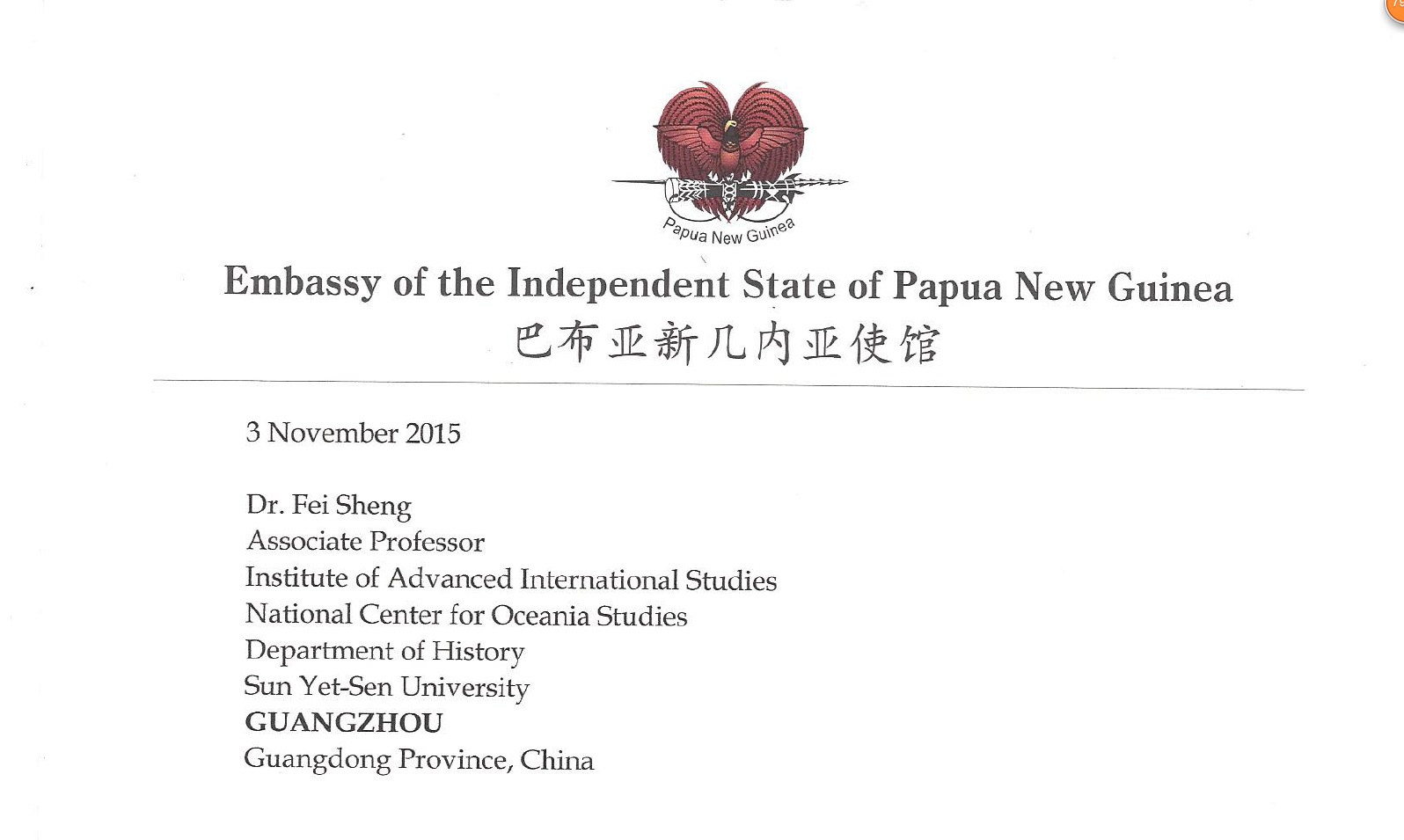 中山大学大洋洲研究中心收到巴布亚新几内亚使馆感谢信